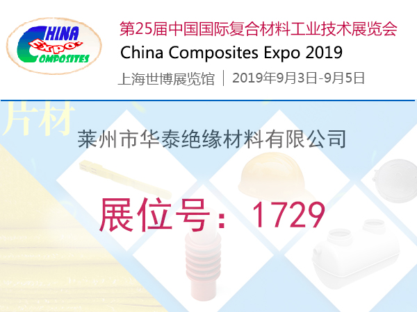 2019.08.12第25屆中國國際復合材料工業技術展覽會,于2019年9月3日到9月5日在上海世博展覽館舉行,萊州市華泰絕緣材料有限公司,展位號1729,歡迎您! -